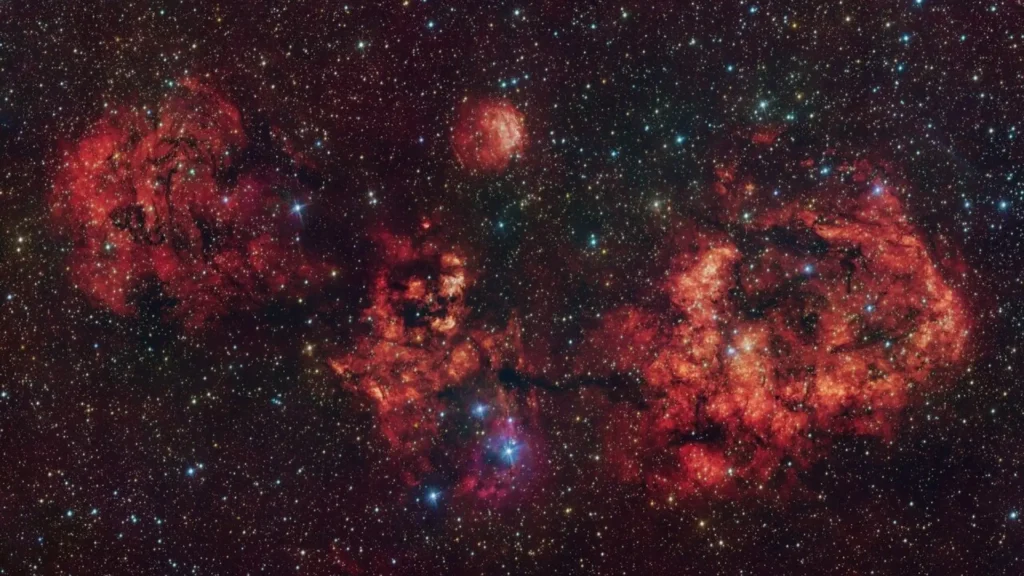 Las estrellas jóvenes que contiene liberan suficiente energía para excitar los átomos de hidrógeno a su alrededor, haciéndolos brillar con el intenso tono rojo que se aprecia en esta llamativa imagen. Los filamentos oscuros de la nebulosa se asemejan al esqueleto de un murciélago espacial.