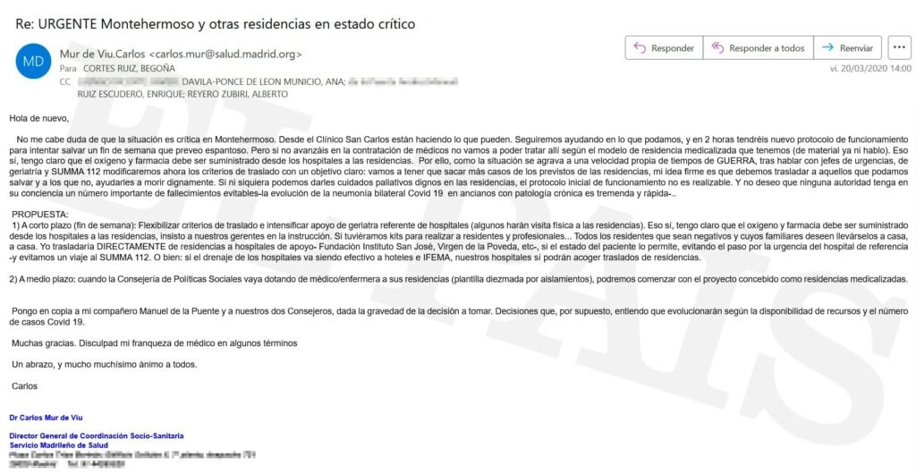 El viernes 20, el escenario era “espantoso”, según describió Mur en su e-mail, enviado a las 14.00. Tres días antes, se había producido una conmoción cuando la prensa reveló que al menos 19 personas mayores habían muerto en la residencia Montehermoso. Aquella noche, Ayuso dijo en Telecinco que esa residencia era una excepción y que “en su práctica totalidad están [estaban] todas medicalizadas“.