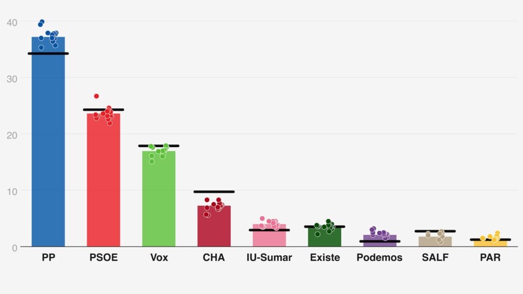 ¿Y nuestra predicción probabilística? Acertó al señalar como un escenario central muy probable la victoria del PP sin mayoría absoluta pero sumando con Vox (le dábamos un 95% de opciones). Los escaños de todos los partidos entraron dentro de las horquillas del 80%. Esas bandas amplias sirvieron su objetivo: advertir que eran posibles resultados que ninguna encuesta individual señalaba como centrales (por ejemplo, que el PP se quedase en 26 escaños o que CHA llegase a 6).