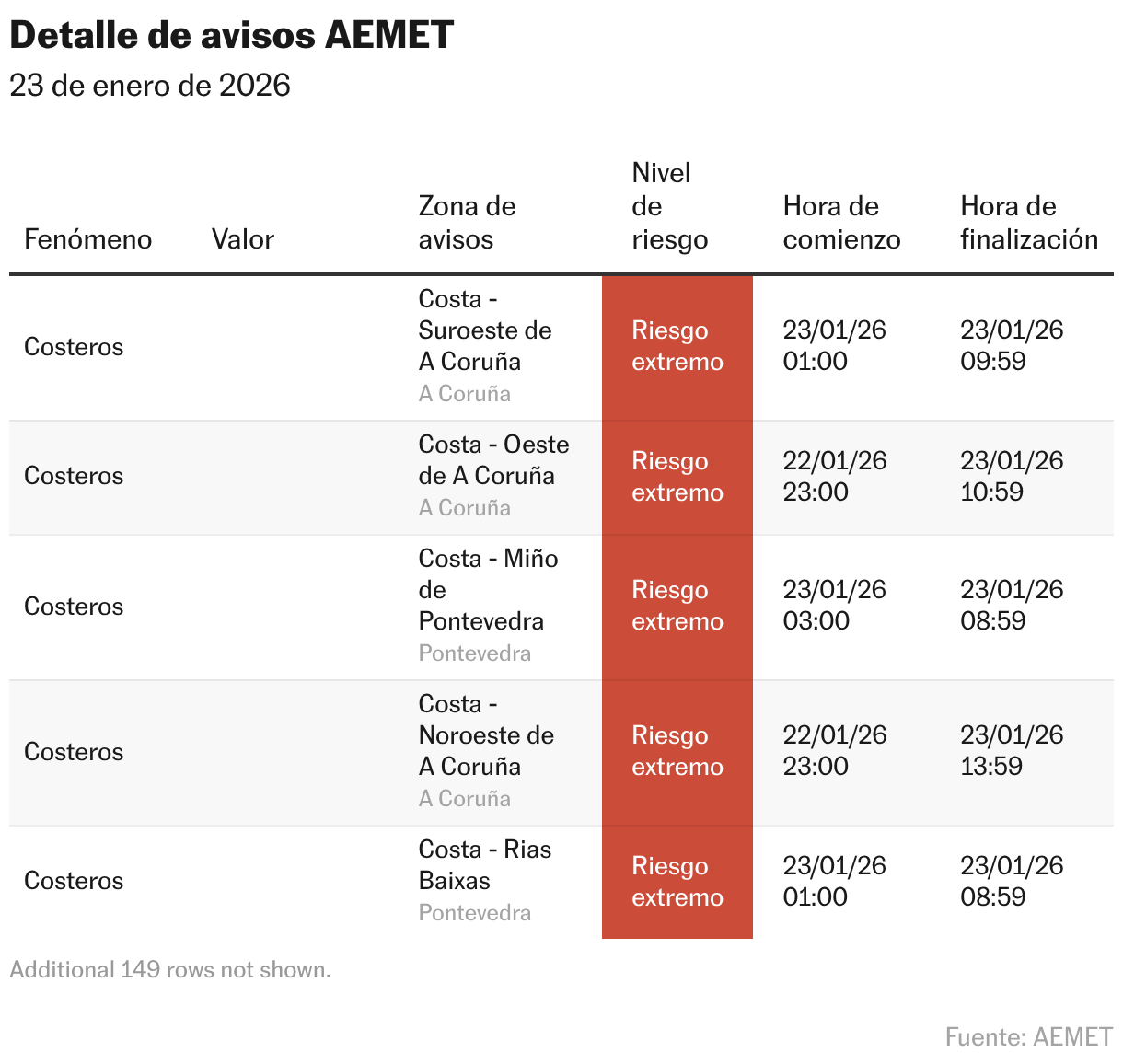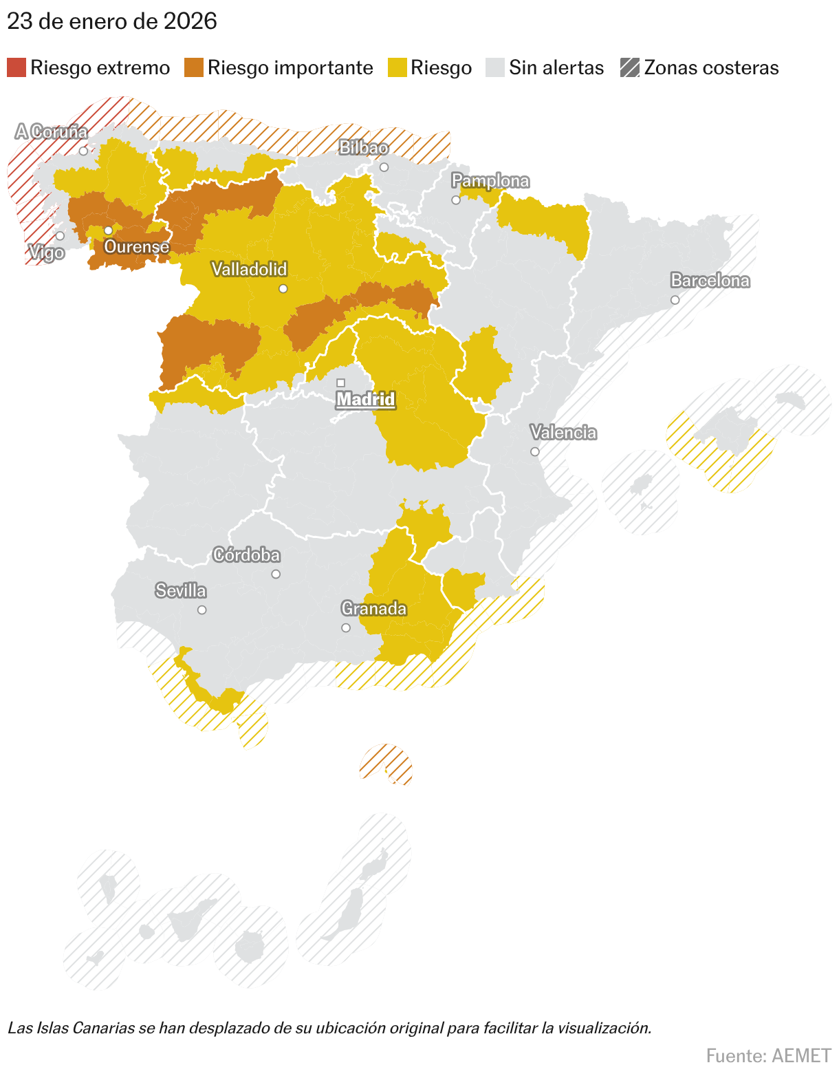 Rubén del Campo, portavoz de la Aemet, ha informado de que este viernes la cota de nieve bajará de forma acusada. En el norte peninsular podrá nevar a partir de los 600 metros, y en Galicia y algunas zonas de Castilla y León, incluso por debajo de los 500. En zonas del centro y de la meseta Sur, se esperan nevadas en forma de chubascos, con acumulaciones rápidas que, junto al viento fuerte, pueden complicar la circulación. Los avisos por nieve se registrarán en Granada y Jaén; Huesca y Teruel; la franja suroccidental asturiana y la Cordillera y Picos de Europa; Ávila, Burgos, Palencia, Salamanca y Valladolid; Albacete, Cuenca y Guadalajara; Cáceres; A Coruña; Sierra de Madrid, Pirineo navarro; y la Ibérica riojana. En el sur, las precipitaciones caerán en forma de lluvia, con temperaturas bajas.